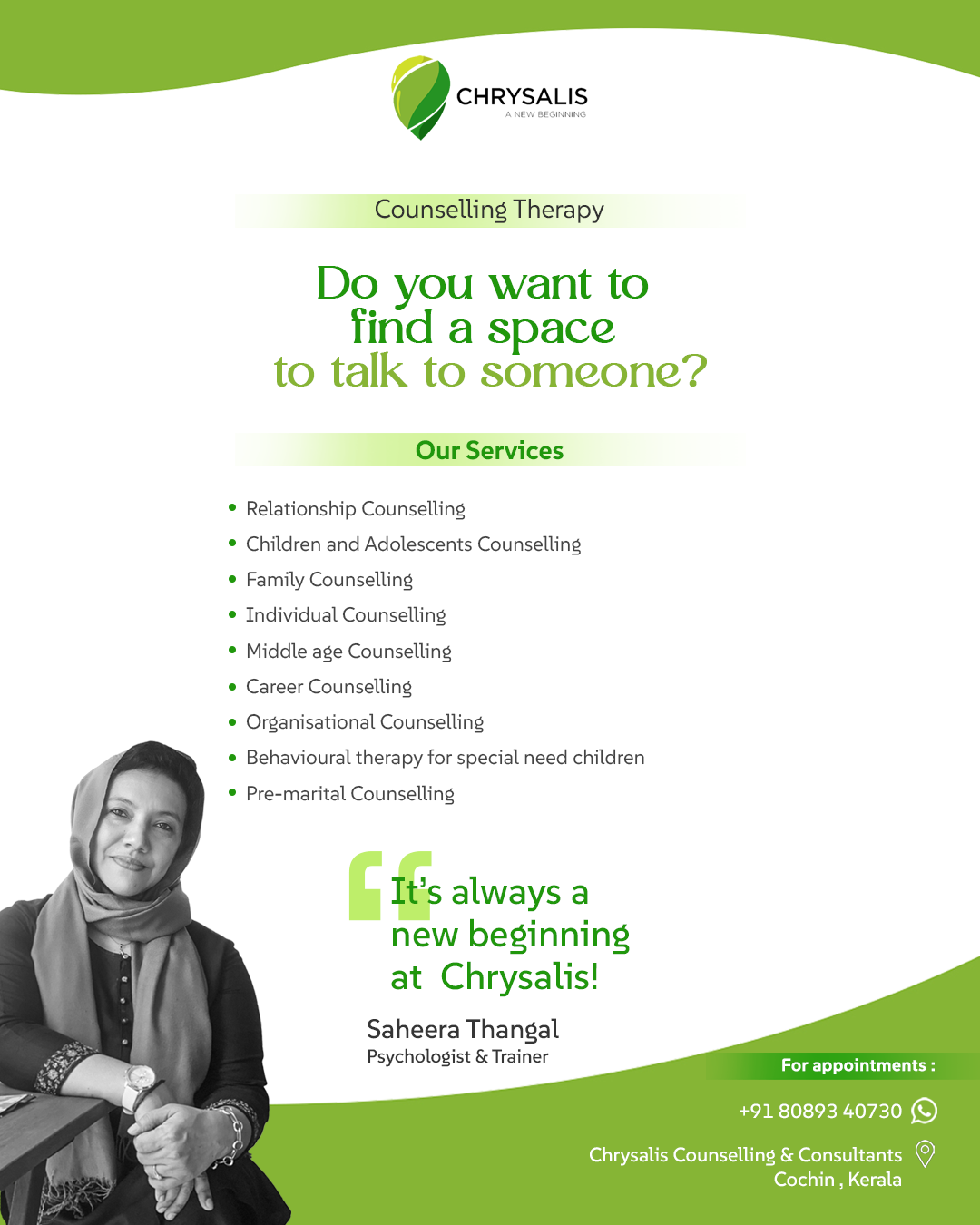 CHRYSALIS is a Counselling and Consultancy firm that essentially offers Relationship Counselling and Training services to the varied age group of Adults, Adolescents and Children.