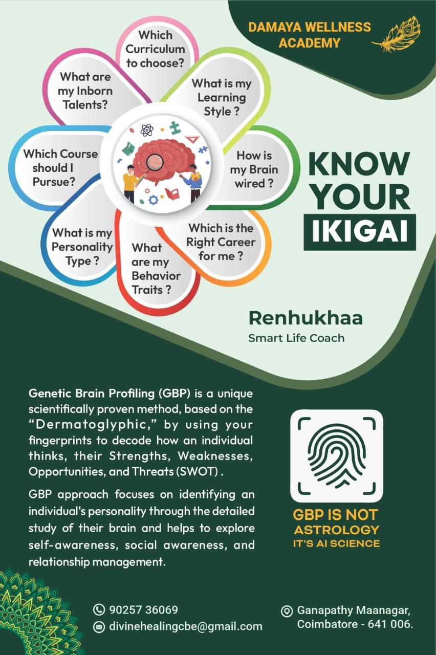 GBP is a technique that uses dermatoglyphics(fingerprint analysis) and behavioral Science to understand an Individual's unique personality traits, learning styles and Potential Strengths. Helping Individuals on their Education, Career paths and Personal development.